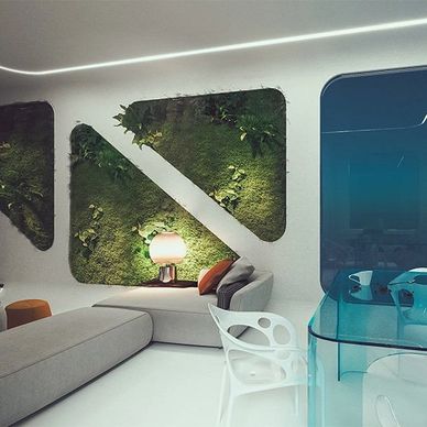 Parametric Graphic 3D wall art is trendy and it's something that we begin with before the furniture inspiration. We can turn a lonely, viewless wall like the room above and add three triangular 3D paintings and smart LED lighting to the ceiling’s edge that will ceramic bring the room to life. Parametric paintings and geometric wall panels add texture to any wall that can help add much-needed visual weight to your futuristic interior design home space. You can use a variety of different mediums — three dimensional paintings, sculptures, shadow boxes, etc. — to add some depth and emotion to any room. We have many options and colors for you to choose from and can be installed temporarily or permanently depending on the package that you choose. Our modern interiors are beautiful and futuristic. Our metallic accessories and nude color tones make a space feel intimate and cutting edge. Alternatively, a creative statement piece can be a focal point to your space, whether it’s a long chair or stand-alone chest of drawers used as a prop to enhance the modern living room. Our modern futuristic furnishings are also available for sale.